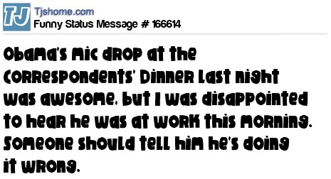 X says Obama's mic drop at the Correspondents' Dinner last night was awesome, but I was disappointed to hear he was at work this morning. Someone should tell him he's doing it wrong.