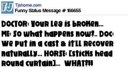 X says DOCTOR: Your leg is broken... ME: So what happens now?.. Doc: We put in a cast & it'll recover naturally... HORSE: [sticks head round curtain]... WHAT?!!
