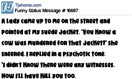 - # 42020 A lady came up to me on the street and pointed at my suede jacket. ‘You know a cow was murdered for that jacket?' she sneered. I replied in a psychotic tone, ‘I didn't know there were any witnesses. Now I'll have to kill you too.