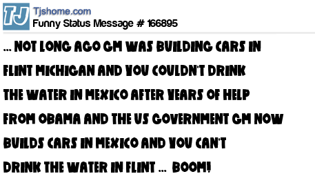 X ... NOT LONG AGO GM WAS BUILDING CARS IN FLINT MICHIGAN AND YOU COULDN'T DRINK THE WATER IN MEXICO AFTER YEARS OF HELP FROM OBAMA AND THE US GOVERNMENT GM NOW BUILDS CARS IN MEXICO AND YOU CAN'T DRINK THE WATER IN FLINT ... BOOM!