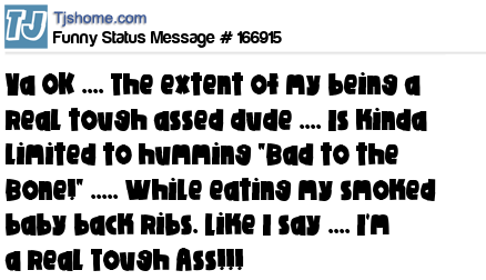 X Ya OK .... The extent of my being a real tough assed dude .... Is kinda limited to humming "Bad to the Bone!" ..... While eating my smoked baby back ribs. Like I say .... I'm a real Tough Ass!!!