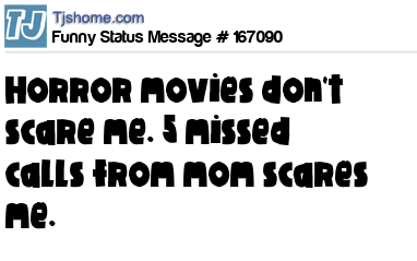 - # 111161 Horror movies don't scare me. Five missed calls from my mother scares me.
