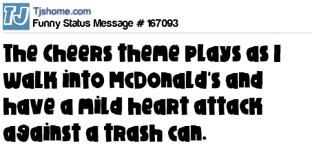 X says The Cheers theme plays as I walk into McDonald's and have a mild heart attack against a trash can.
