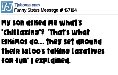 X says My son asked me what's "Chillaxing"?  "That's what Eskimos do.... they set around their igloo's taking laxatives for fun" I explained.