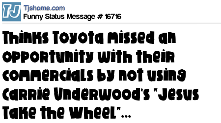 X  thinks Toyota missed an opportunity with their commercials by not using Carrie Underwood's "Jesus Take the Wheel"...