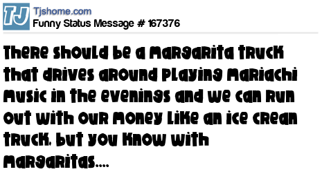 X says There should be a margarita truck that drives around playing mariachi music in the evenings and we can run out with our money like an ice crean truck, but you know with margaritas....