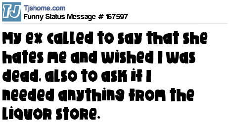 X says My ex called to say that she hates me and wished I was dead, also to ask if I needed anything from the liquor store.