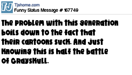 X says The problem with this generation boils down to the fact that their cartoons suck. And just knowing this is half the battle of Grayskull.