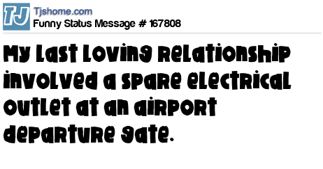 X says My last loving relationship involved a spare electrical outlet at an airport departure gate.
