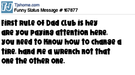 X says First rule of Dad Club is hey are you paying attention here, you need to know how to change a tire, hand me a wrench not that one the other one.