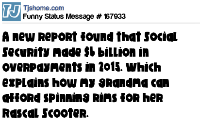 X says A new report found that Social Security made $6 billion in overpayments in 2015. Which explains how my grandma can afford spinning rims for her Rascal Scooter.