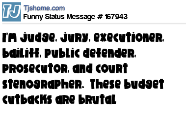- # 167954 I'm judge, jury, executioner, bailiff, public defender, prosecutor, and court stenographer. These budget cutbacks are brutal.