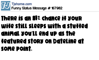 X says There is an 87% chance if your wife still sleeps with a stuffed animal you'll end up as the featured story on Dateline at some point.