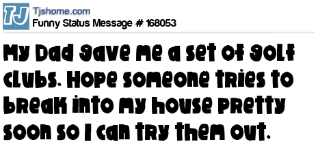 X says My Dad gave me a set of golf clubs. Hope someone tries to break into my house pretty soon so I can try them out.