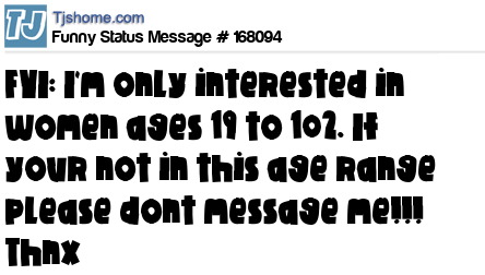 X says FYI: I'm only interested in women ages 19 to 102. If your not in this age range please dont message me!!! Thnx