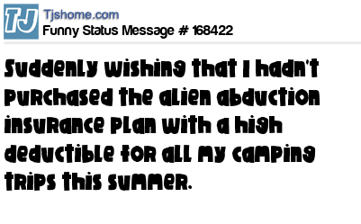 X says Suddenly wishing that I hadn't purchased the alien abduction insurance plan with a high deductible for all my camping trips this summer.