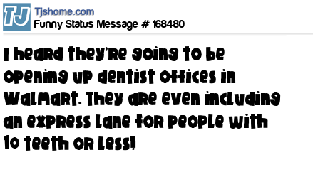 - # 63312 I heard they're going to be opening up dentist offices in Walmart. They are even including an express lane for people with 15 teeth or less!