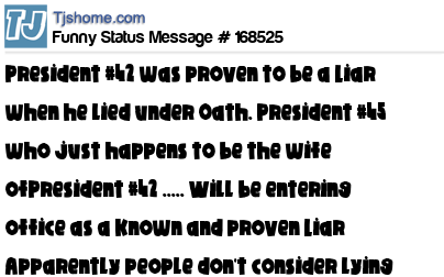 X President #42 was proven to be a Liar when he lied under Oath. President #45 who just happens to be the wife ofPresident #42 ..... Will be entering office as a Known and proven Liar Apparently people don't consider lying as a character flaw anymore.