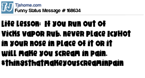 X  Life lesson:  If you run out of Vicks vapor rub, never place IcyHot in your nose in place of it or it will make you scream in pain.  #thingsthatmakeyouscreaminpain