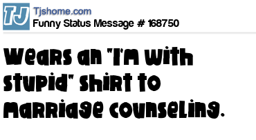 - # 167959 Always wears an "I'm with stupid" shirt to marriage counseling.
