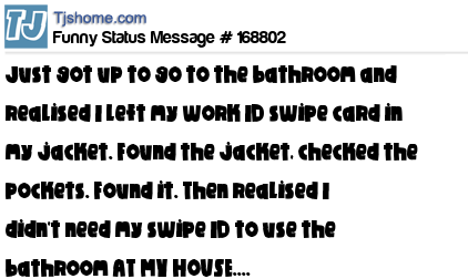X says Just got up to go to the bathroom and realised I left my work ID swipe card in my jacket. Found the jacket, checked the pockets. Found it. Then realised I didn't need my swipe ID to use the bathroom AT MY HOUSE....π