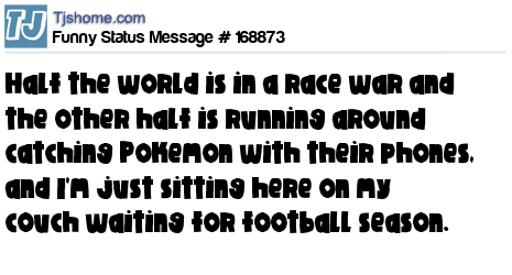 X says Half the world is in a race war and the other half is running around catching Pokemon with their phones, and I'm just sitting here on my couch waiting for football season.