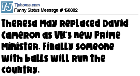 X says Theresa May replaced David Cameron as UK's new Prime Minister. Finally someone with balls will run the country.