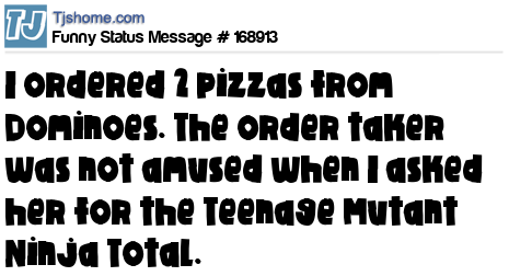 X I ordered 2 pizzas from Dominoes. The order taker was not amused when I asked her for the Teenage Mutant Ninja Total.
