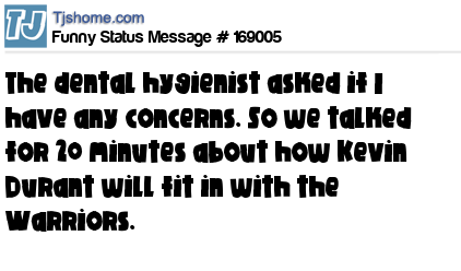 X says The dental hygienist asked if I have any concerns. So we talked for 20 minutes about how Kevin Durant will fit in with the Warriors.