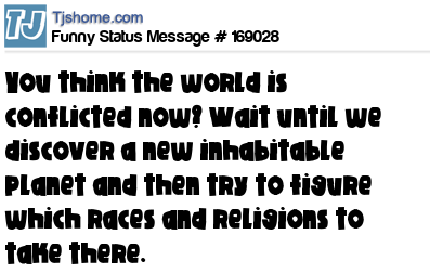 X says You think the world is conflicted now? Wait until we discover a new inhabitable planet and then try to figure which races and religions to take there.