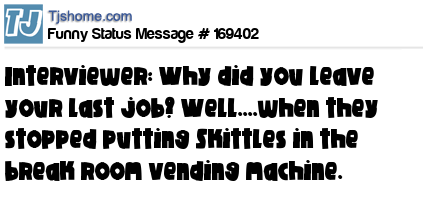 - # 206699 Interviewer: Why did you leave your last job? Well....when they stopped putting Skittles in the damn break room vending machine.