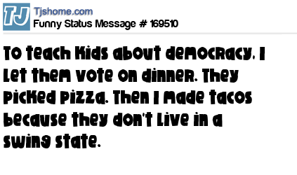 X says To teach kids about democracy, I let them vote on dinner. They picked pizza. Then I made tacos because they don't live in a swing state.