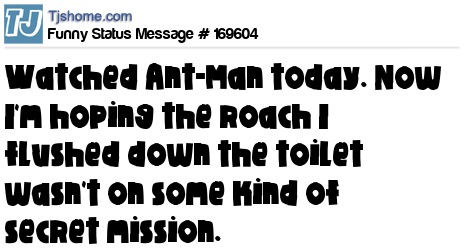 X says Watched Ant-Man today. Now I'm hoping the roach I flushed down the toilet wasn't on some kind of secret mission.