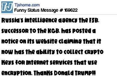X says Russia's intelligence agency the FSB, successor to the KGB, has posted a notice on its website claiming that it now has the ability to collect crypto keys for Internet services that use encryption. Thanks Donald Trump!!