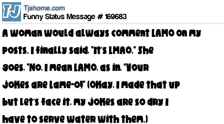- # 169124 There was this woman who always juxtaposed the letters in LMAO whenever I told a joke. She'd put LAMO. I tired to correct her. She said, "No, your jokes are lame."
