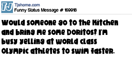X says Would someone go to the kitchen and bring me some Doritos? I'm busy yelling at world class Olympic athletes to swim faster.