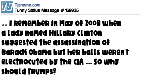 X .... I remember in May of 2008 when a lady named Hillary Clinton suggested the assassination of Barack Obama but her balls weren't electrocuted by the CIA .... So why should Trumps?