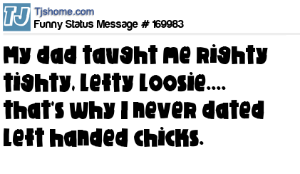 - # 166561 I never date left handed women. Righty tighty, lefty loosey.