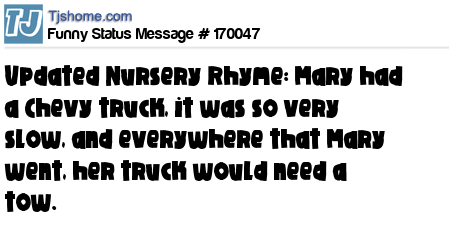 X says Updated Nursery Rhyme: Mary had a Chevy truck, it was so very slow, and everywhere that Mary went, her truck would need a tow.
