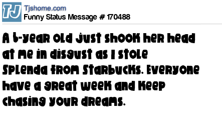 X says A 6-year old just shook her head at me in disgust as I stole Splenda from Starbucks. Everyone have a great week and keep chasing your dreams.