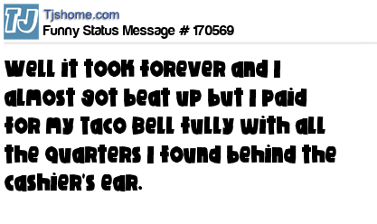 X says Well it took forever and I almost got beat up but I paid for my Taco Bell fully with all the quarters I found behind the cashier's ear.