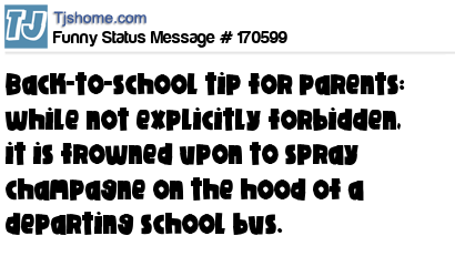 X says Back-to-school tip for parents: while not explicitly forbidden, it is frowned upon to spray champagne on the hood of a departing school bus.