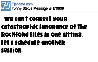 X says We can’t correct your catastrophic ignorance of The Rockford Files in one sitting. Let’s schedule another session.