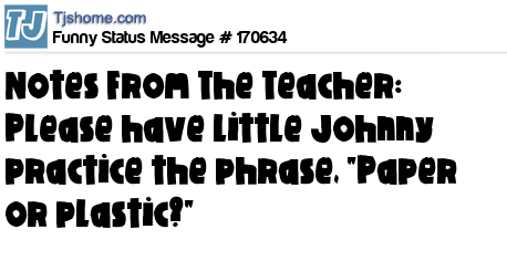 X says Notes From The Teacher: Please have little Johnny practice the phrase, "Paper or plastic?"