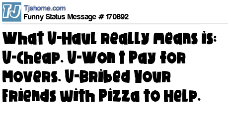 X says What U-Haul really means is: U-Cheap. U-Won’t Pay for Movers. U-Bribed Your Friends with Pizza to Help.