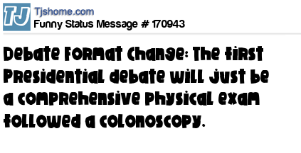 X says Debate Format Change: The first Presidential debate will just be a comprehensive physical exam followed a colonoscopy.