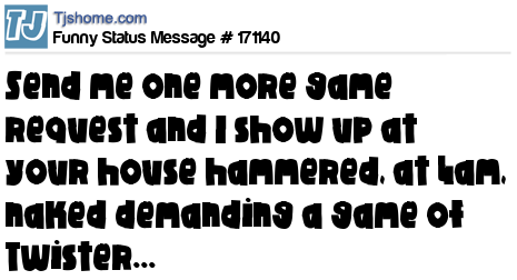 X says Send me one more game request and I show up at your house hammered, at 4am, naked demanding a game of Twister...