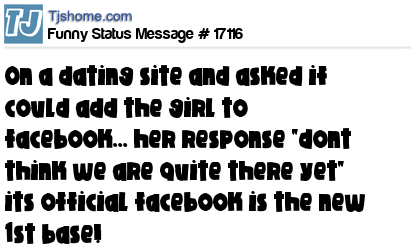 X was on a dating site and asked if could add the girl to facebook... her response "dont think we are quite there yet" its official facebook is the new 1st base!