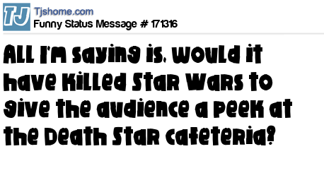 X says All I'm saying is, would it have killed Star Wars to give the audience a peek at the Death Star cafeteria?