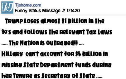 X says Trump loses almost $1 Billion in the 90's and follows the relevant Tax Laws ..... The Nation is Outraged!! .... Hillary can't account for $6 Billion in missing State Department funds during her Tenure as Secretary of State ..... Meh